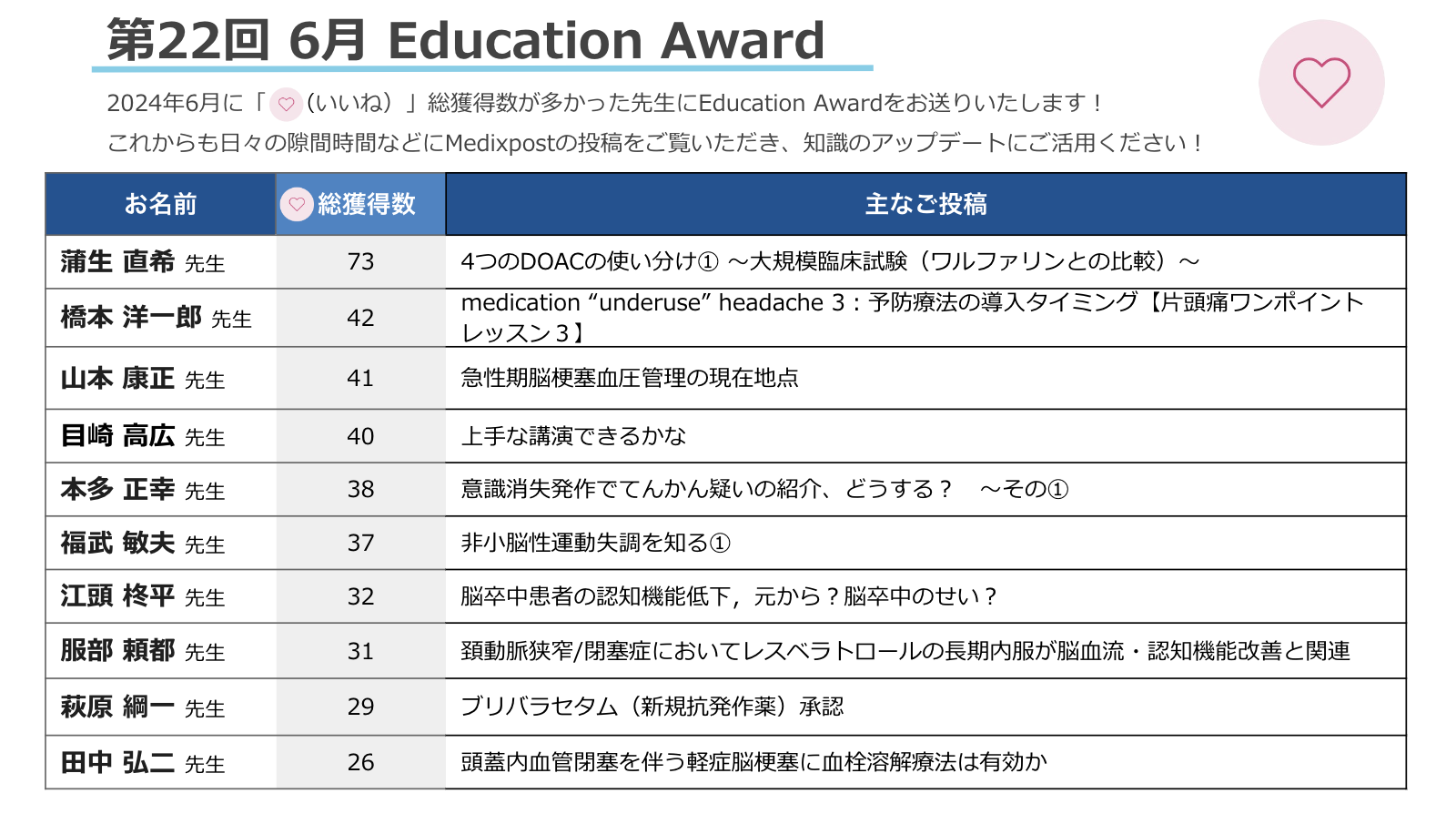 6月のご投稿でいいね総獲得数が多かった先生に恒例の月間Education Awardをお送りいたします。