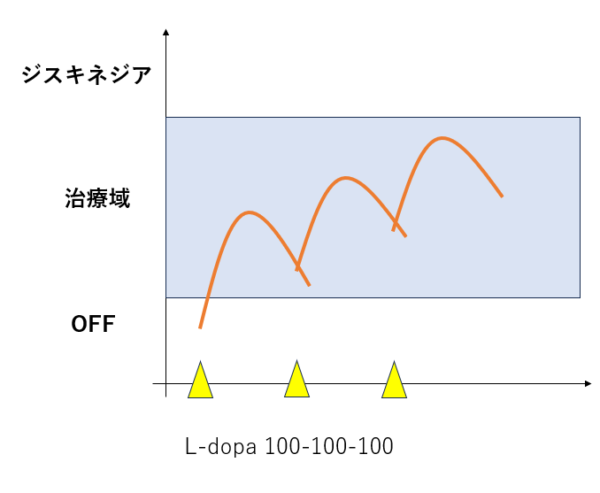 ここでONになっていなければ、No-ONとして150-150-150 mgへと増量します。また早朝のOFFが強いなどあれば、起床時・朝昼夕食後(400 mg/day)などと増やします。このときに、薬剤濃度を想像して治療域に入るように調整するとわかりやすいです(下図)。下図のケースは発症数年以内で1日3回内服でONになっている早期のケースです(ハネムーン期)。
