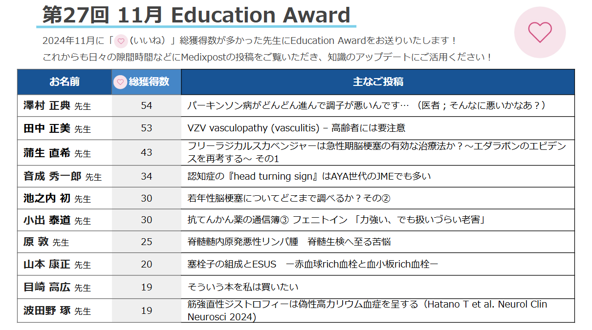 11月のご投稿でいいね総獲得数が多かった先生に恒例の月間Education Awardをお送りいたします。